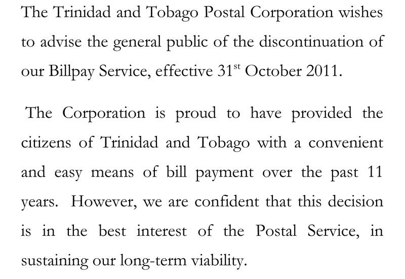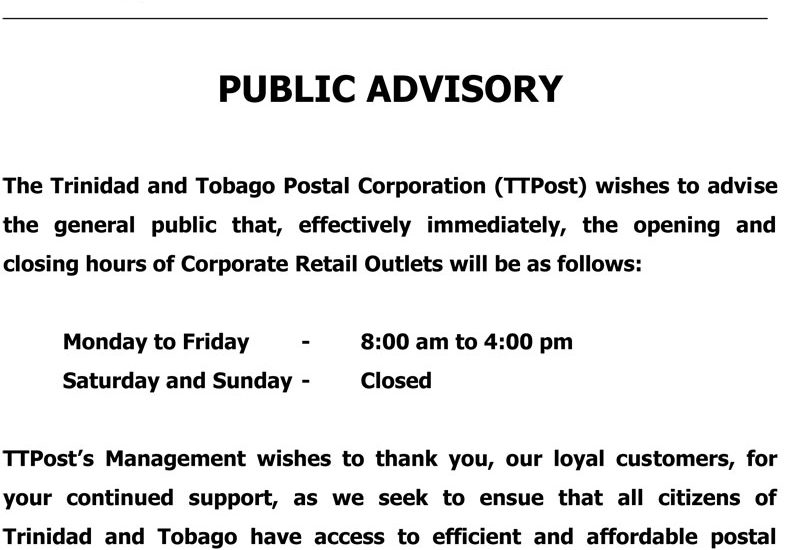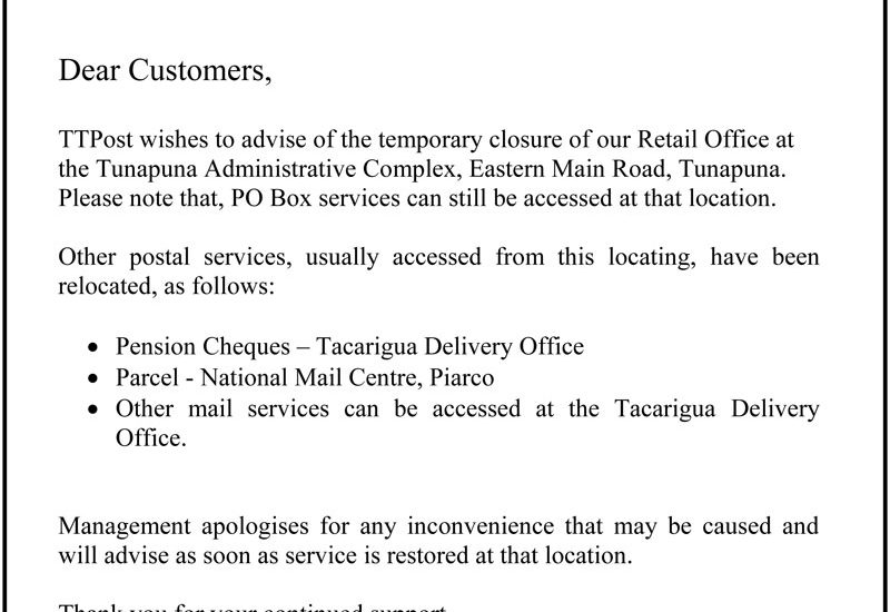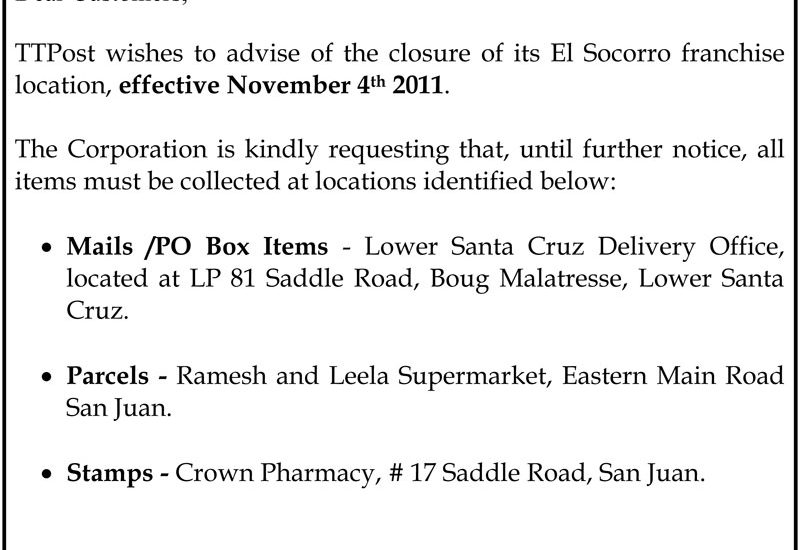 TTPost Outlet located within Shoppes of Maraval will be closed to the public effective 28th October 2011